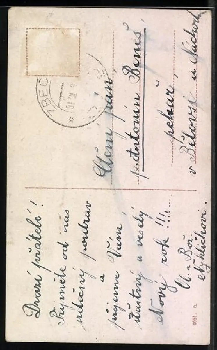 Personenbezogene Daten auf der Rückseite der Karte wurden durch blauen Textmarker unkenntlich gemacht. Die blauen Stellen sind auf die Vorderseite durchgeweicht und wirken sich negativ auf das Postkartenfoto aus
