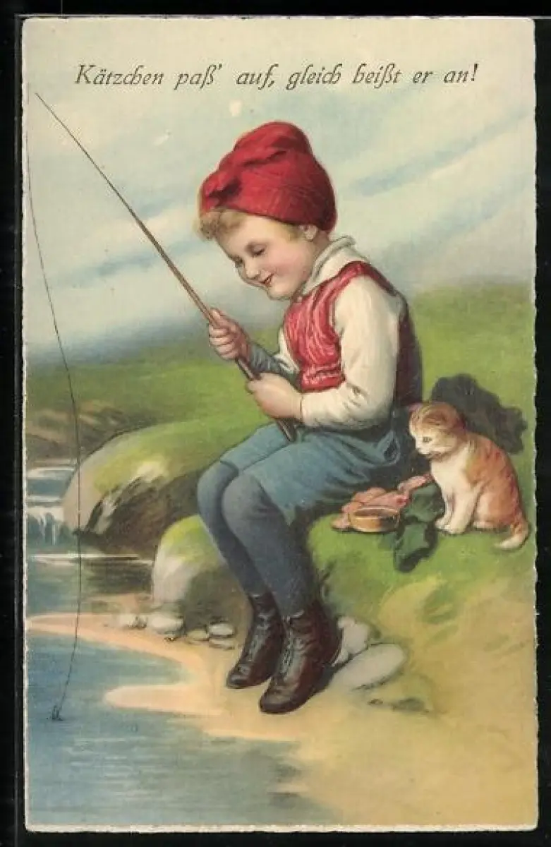 AK Kind mit einer Angel, Katze
