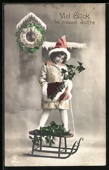 AK Kind steht auf einem Schlitten mit Stechpalmenzweig, Viel Glück im neuen Jahre