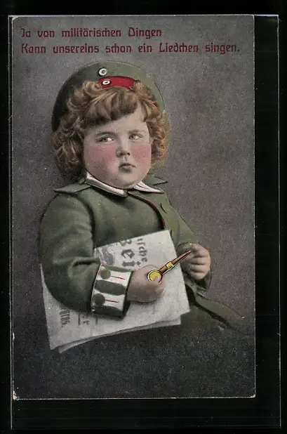 AK Kinder Kriegspropaganda, Mädchen in Uniform mit Zeitung und Pfeife