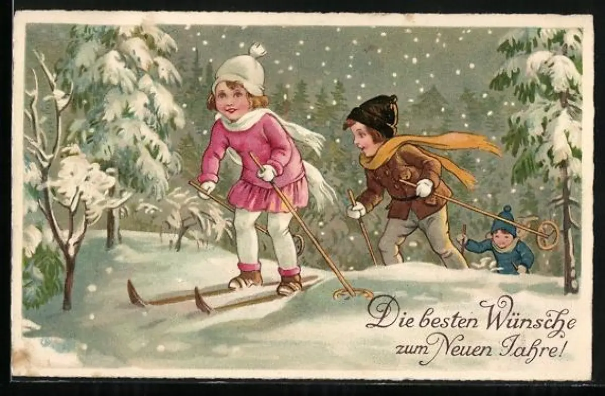AK Kinder auf Skiern bei Schneefall, Neujahrsgruss
