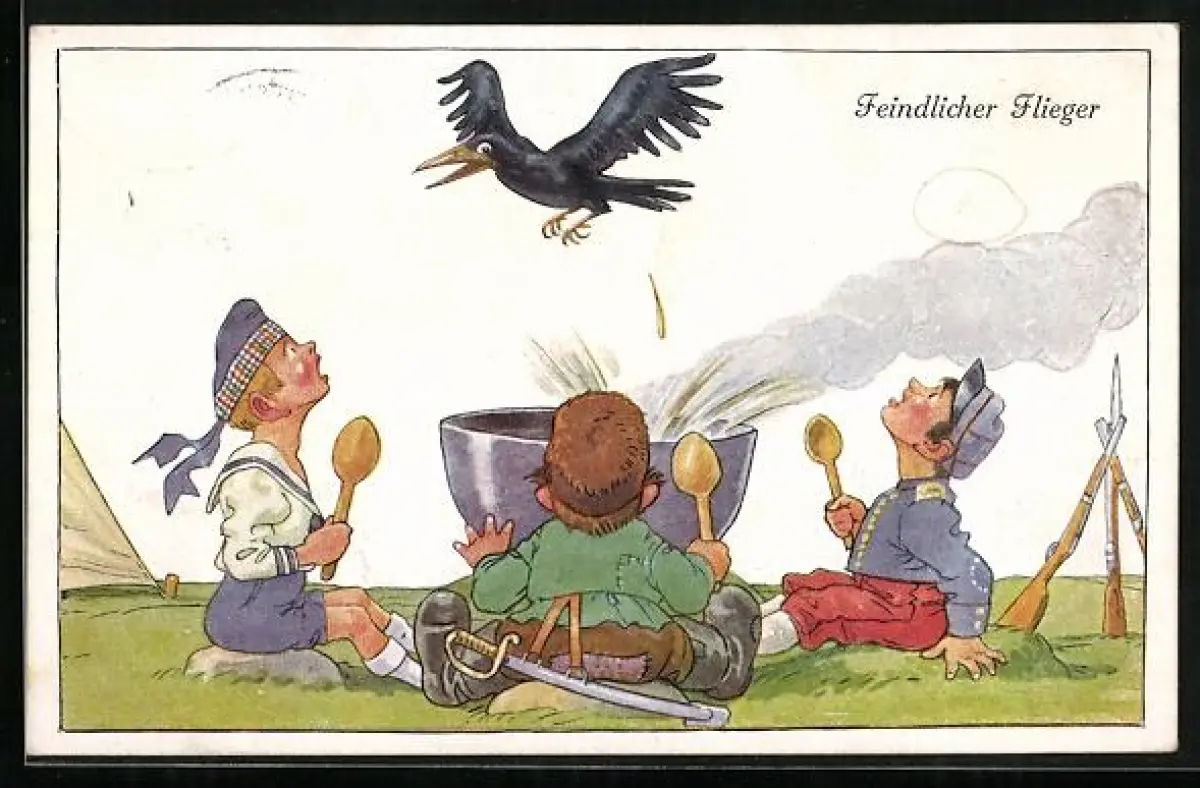 AK Kindliche Soldaten an der Kochstelle unter Beschuss von einem feindlichen Flieger