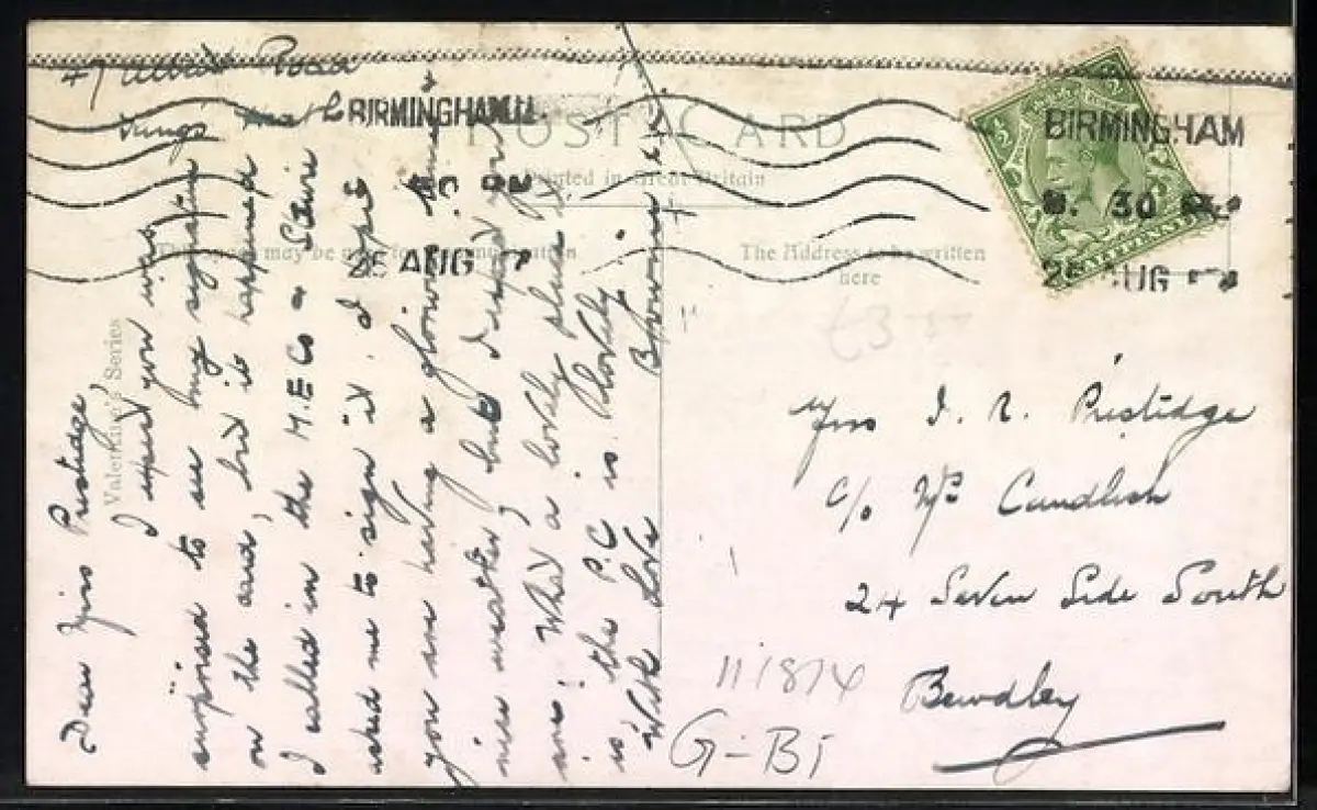 Personenbezogene Daten auf der Rückseite der Karte wurden durch blauen Textmarker unkenntlich gemacht. Die blauen Stellen sind auf die Vorderseite durchgeweicht und wirken sich negativ auf das Postkartenfoto aus