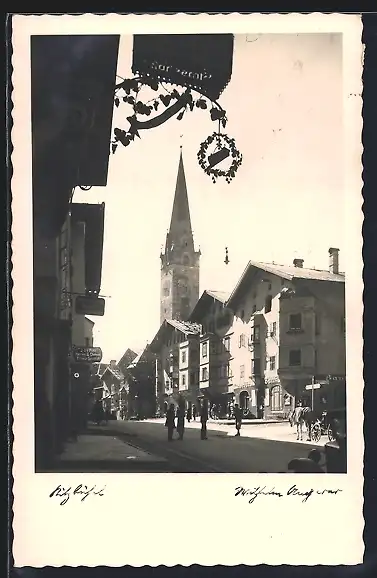 AK Kitzbühel, Strassenpartie mit J. Da Pont`s Friseurgeschäft und Blick zur Kirche
