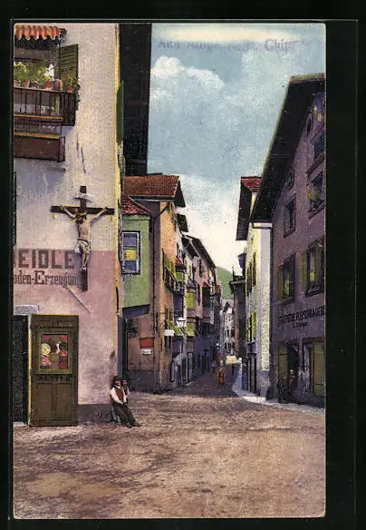 AK Klausen, Strassenpartie mit Fleischhauerei und Kruzifix an Hauswand