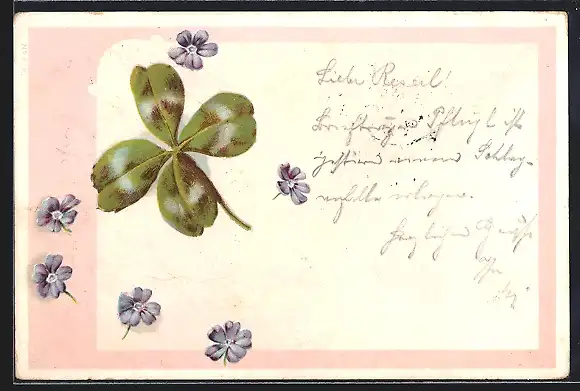 AK Kleeblatt und violette Blüten auf rosa Hintergrund