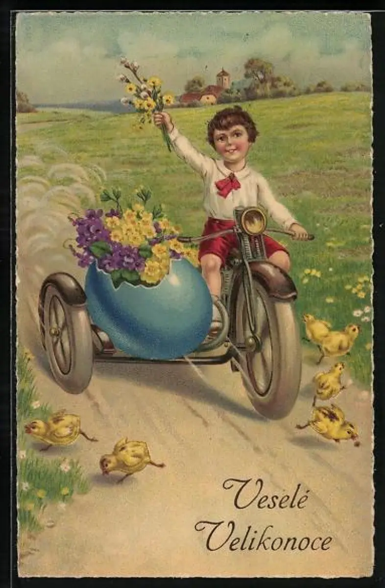 AK Kleiner Junge auf Motorrad mit Beiwagen, dieser in Form von Osterei