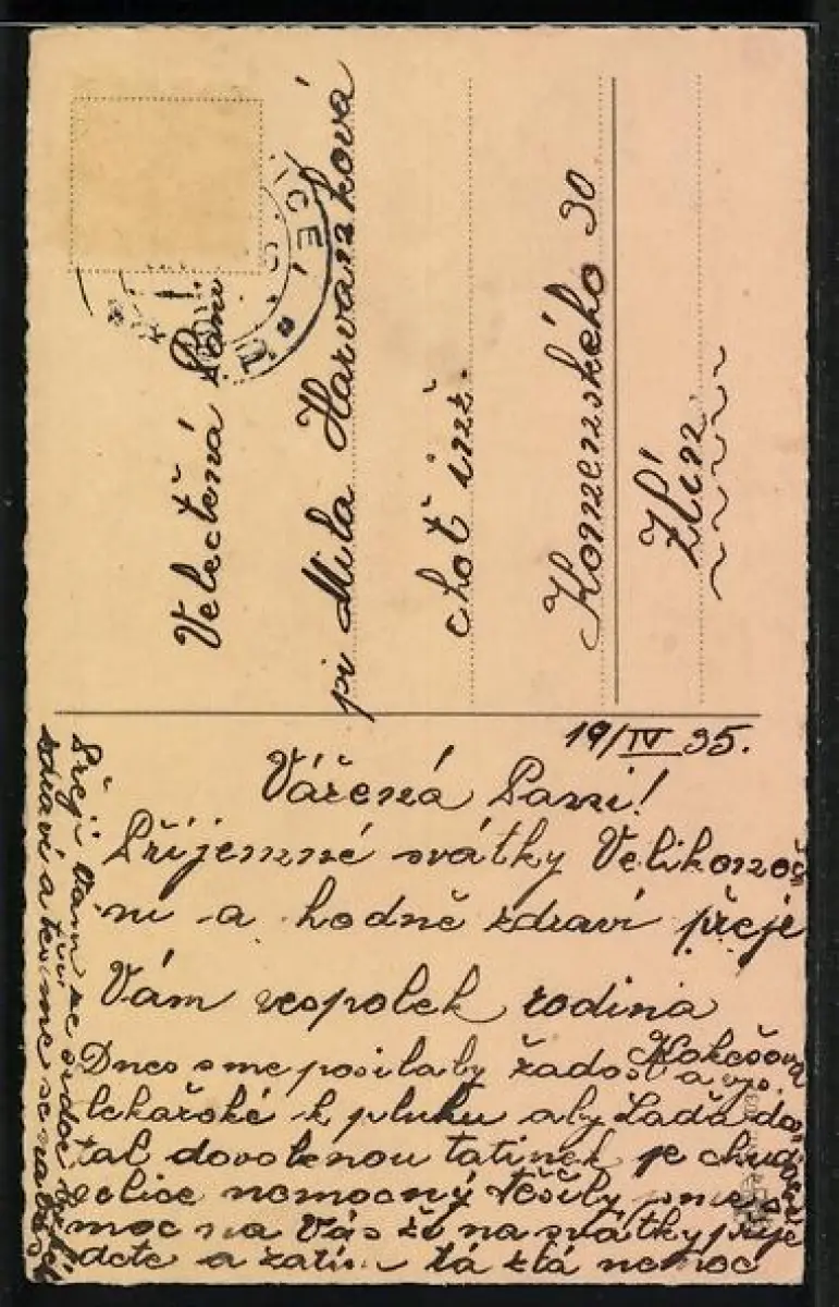 Personenbezogene Daten auf der Rückseite der Karte wurden durch blauen Textmarker unkenntlich gemacht. Die blauen Stellen sind auf die Vorderseite durchgeweicht und wirken sich negativ auf das Postkartenfoto aus
