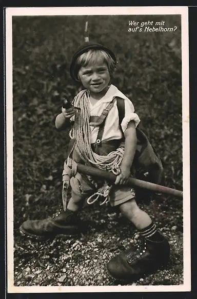 AK Kleiner Junge in Bergsteigermontur mit Pfeife und Spitzhacke, Wer geht mit auf`s Nebelhorn?