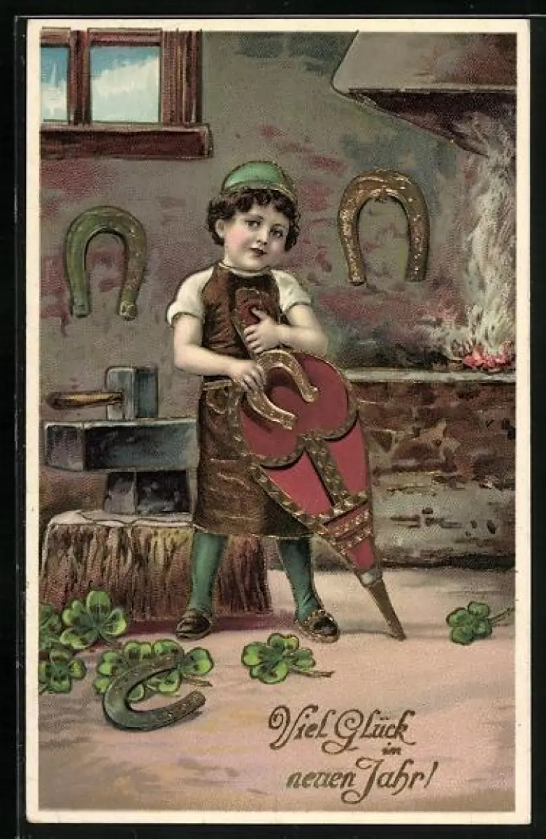 AK Kleiner Schmied mit einem Hufeisen, Neujahrsgruss