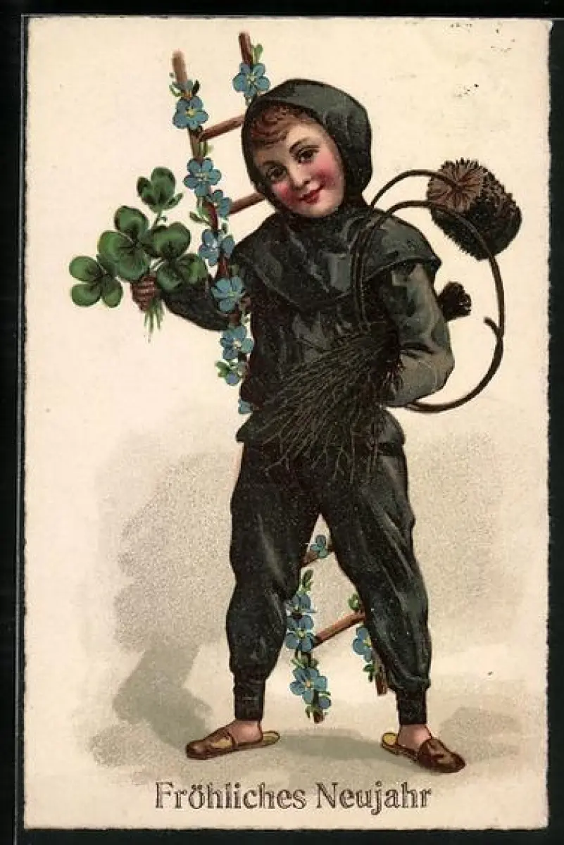 AK Kleiner Schornsteinfeger mit Kleeblätter und Vergissmeinnicht an seiner Leiter, Fröhliches Neujahr
