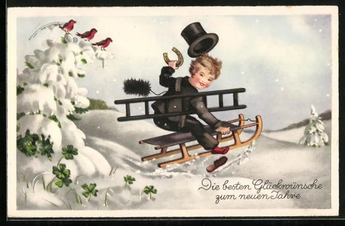 AK Kleiner Schornsteinfeger rodelt mit einem Schlitten einen Hügel hinab, Neujahr