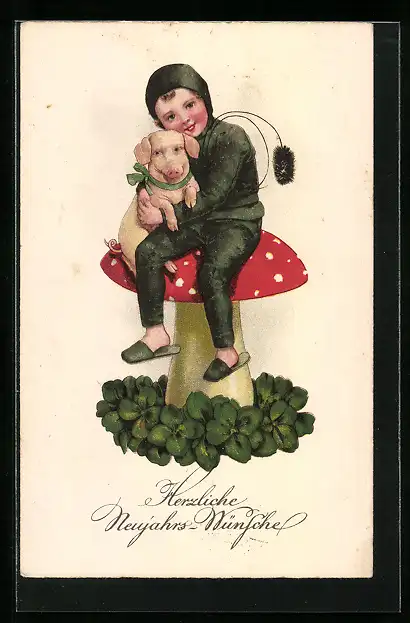 AK Kleiner Schornsteinfeger sitzt mit Ferkel auf einem Glückspilz, Neujahrsgruss