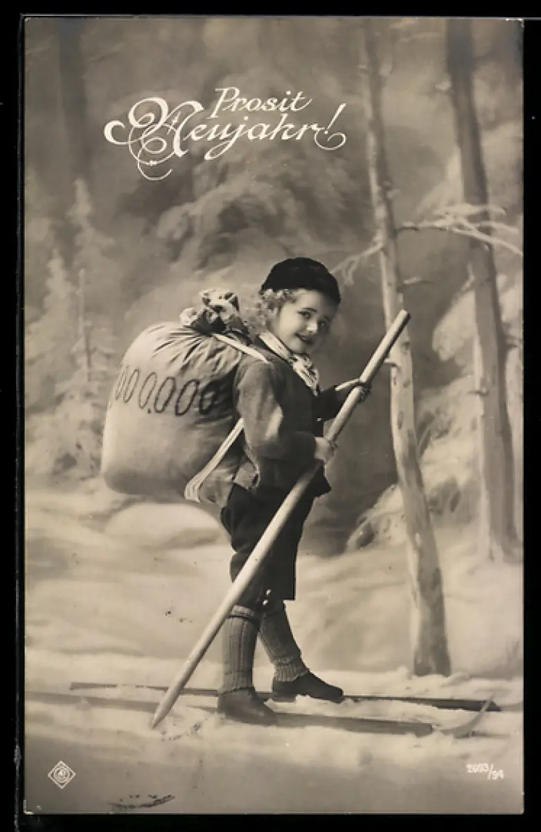 AK Kleiner Skiläufer mit Geld-Rucksack, Neujahrsgruss