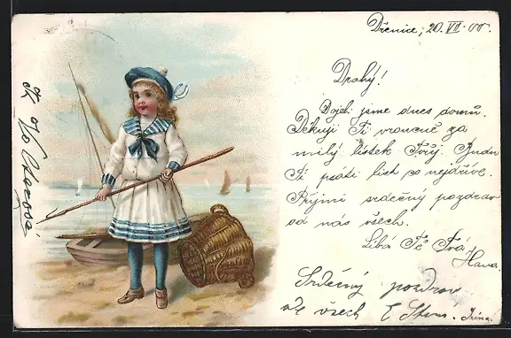AK Kleines Mädchen im Matrosenkleid mit Spiess, Fischerei