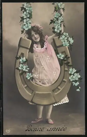 AK Kleines Mädchen mit Hufeisen und Neujahrsgruss