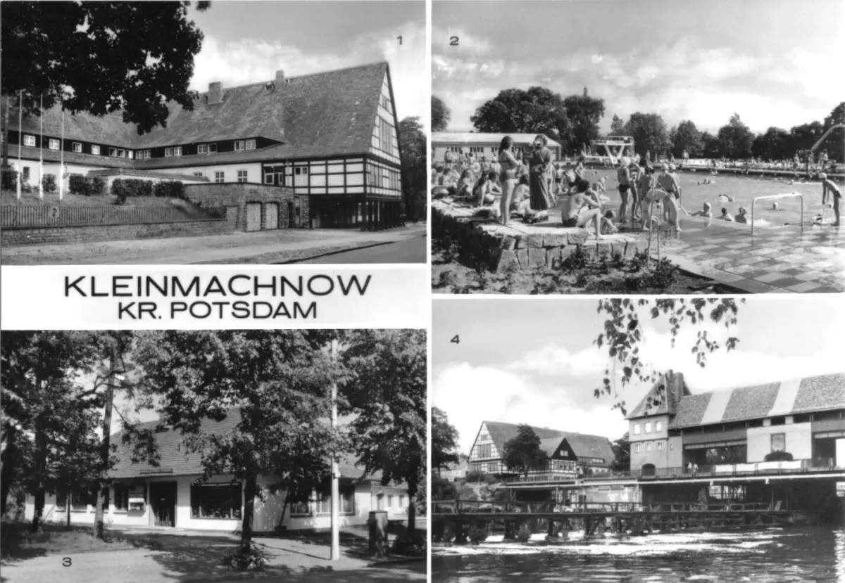 Ansichtskarte Kleinmachnow Kr. Potsdam vier Abb. - BBS für Wasserbau, Freibad Kiebitzenberge, Terrassenrestaurant, Schleuse am Teltowkanal Erhaltung I ungelaufen Druckvermerk: 1984 Herstellungsland: DDR Verlag: Bild und Heimat, Reichenbach i. V. - 01 04 12 042