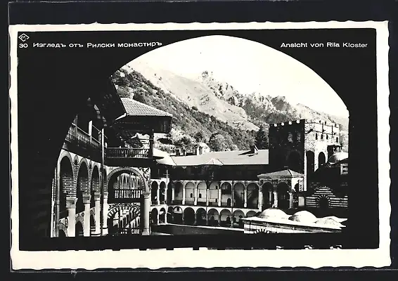 AK Kloster Rila, Ortsansicht mit Bergblick