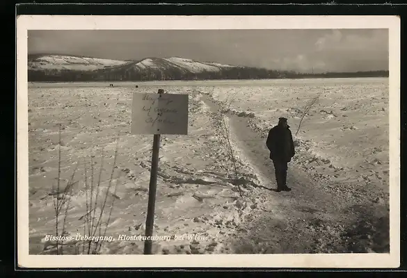AK Klosterneuburg, Eisstoss-Übergang mit Passanten