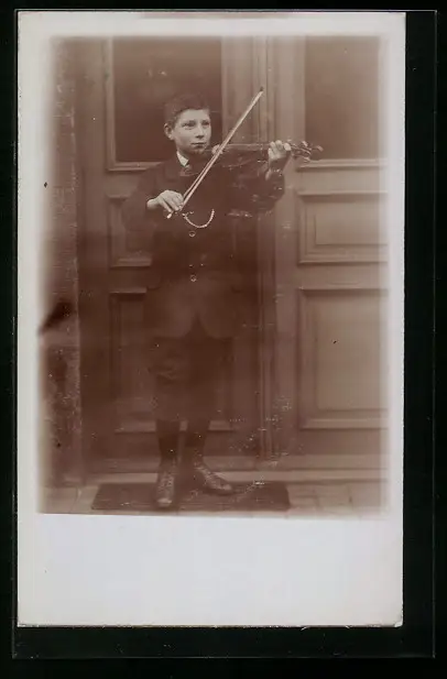 AK Knabe mit Geige vor einer Haustür