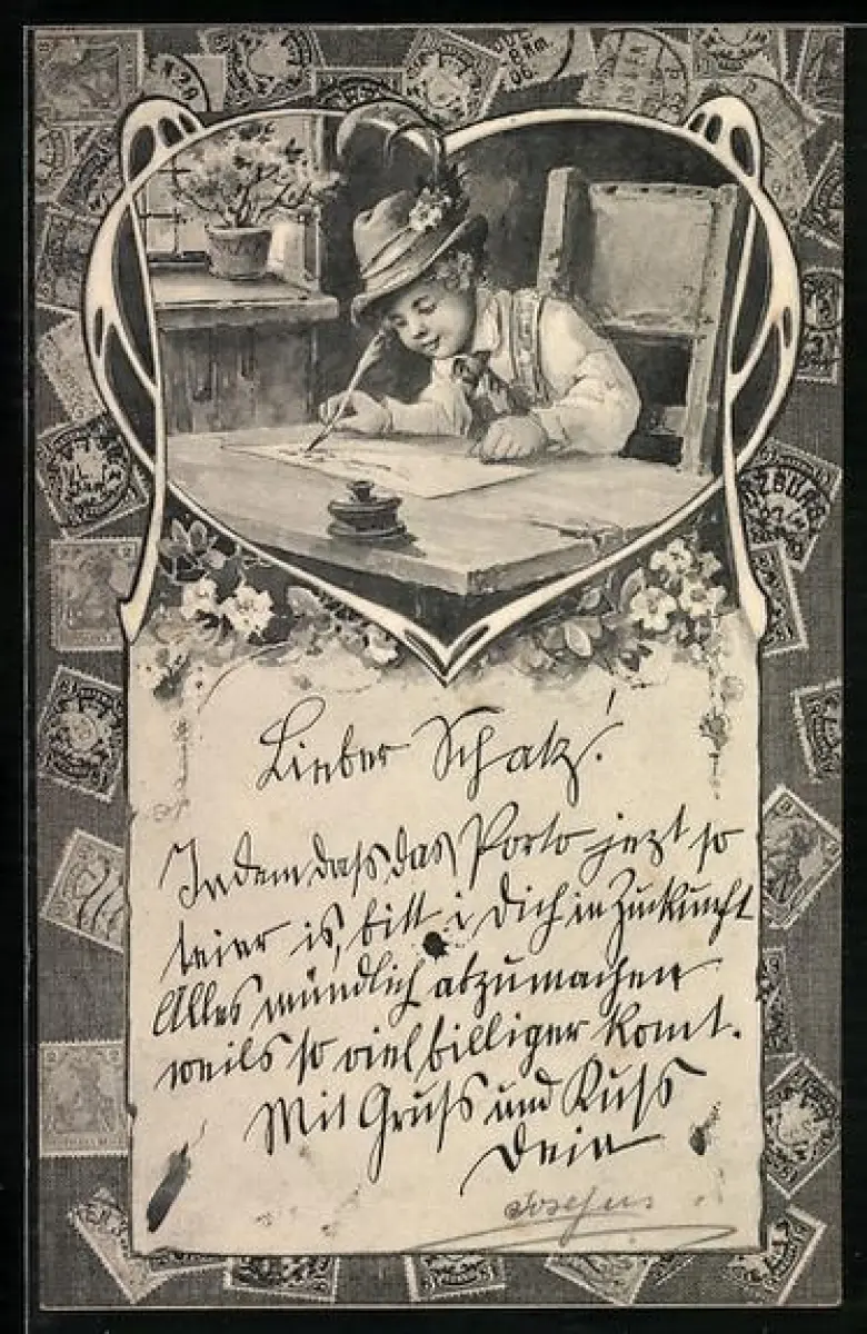 AK Knabe schreibt einen langen Brief, Briefmarken Bayerns und des Deutschen Reichs