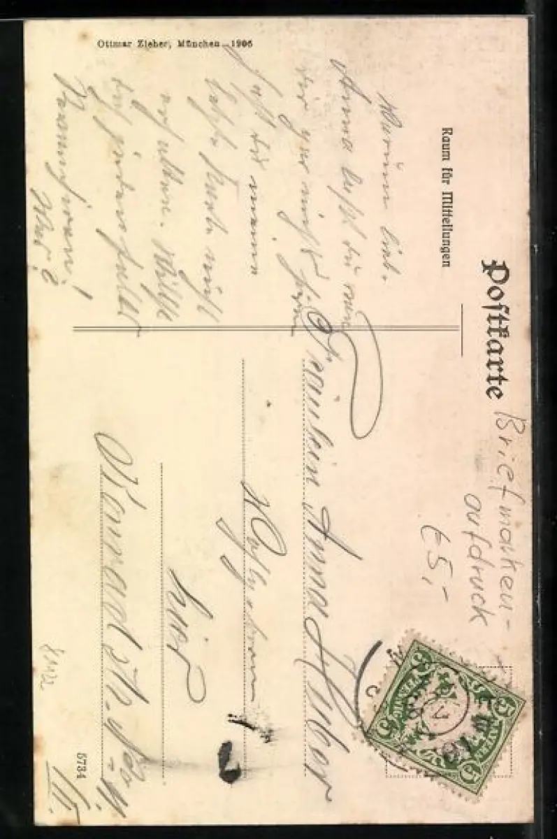 Personenbezogene Daten auf der Rückseite der Karte wurden durch blauen Textmarker unkenntlich gemacht. Die blauen Stellen sind auf die Vorderseite durchgeweicht und wirken sich negativ auf das Postkartenfoto aus