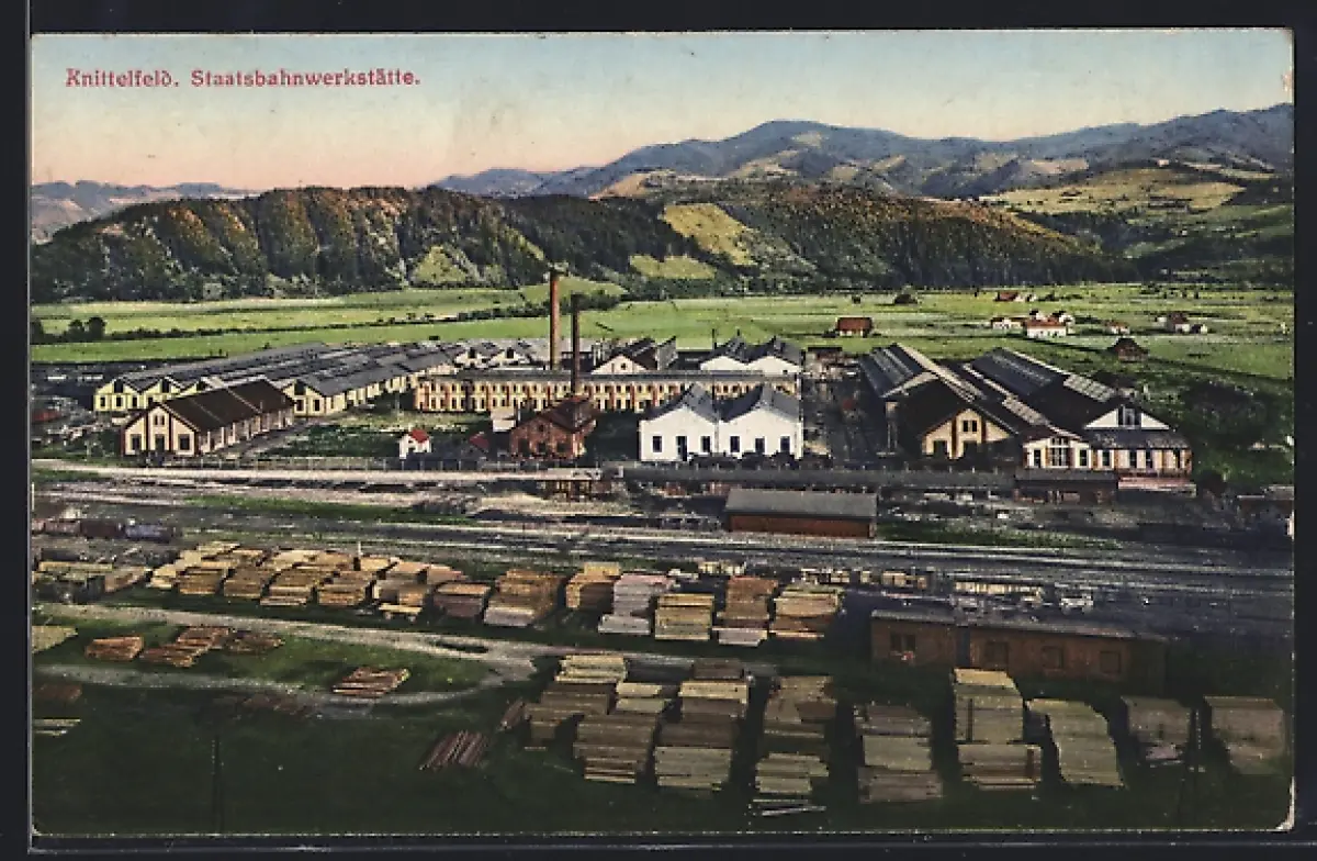 AK Knittelfeld, Staatsbahnwekstätte mit Bahn aus der Vogelschau, Holzlager