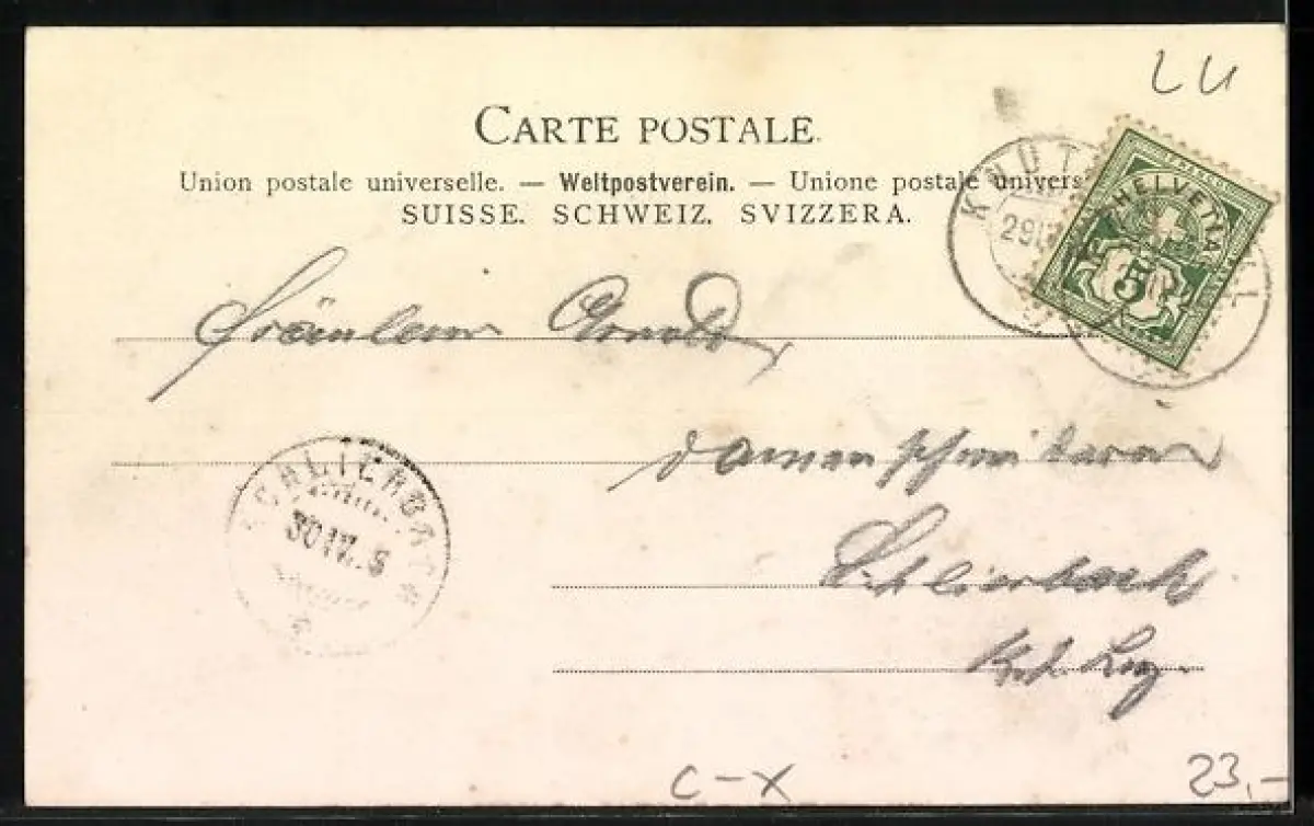 Personenbezogene Daten auf der Rückseite der Karte wurden durch blauen Textmarker unkenntlich gemacht. Die blauen Stellen sind auf die Vorderseite durchgeweicht und wirken sich negativ auf das Postkartenfoto aus