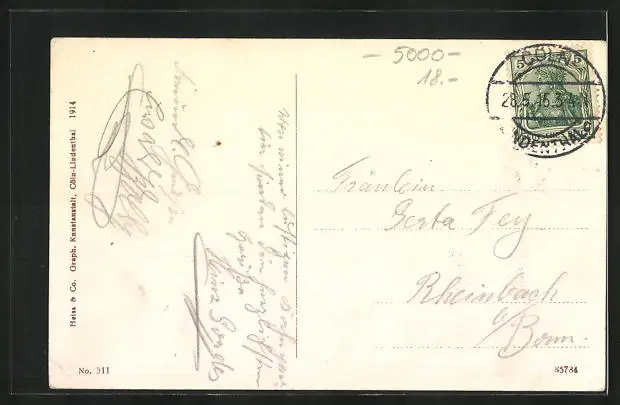 gelaufen 1915, Eckknick unten rechts, guter Zustand