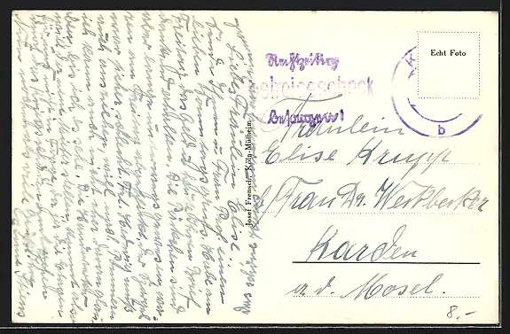 Personenbezogene Daten auf der Rückseite der Karte wurden durch blauen Textmarker unkenntlich gemacht. Die blauen Stellen sind auf die Vorderseite durchgeweicht und wirken sich negativ auf das Postkartenfoto aus