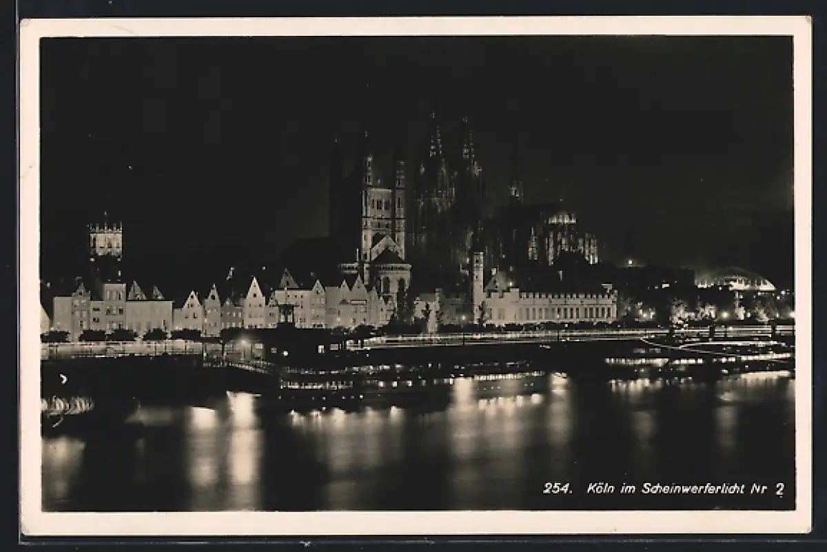 AK Köln, Nachtaufnahme im Scheinwerferlicht