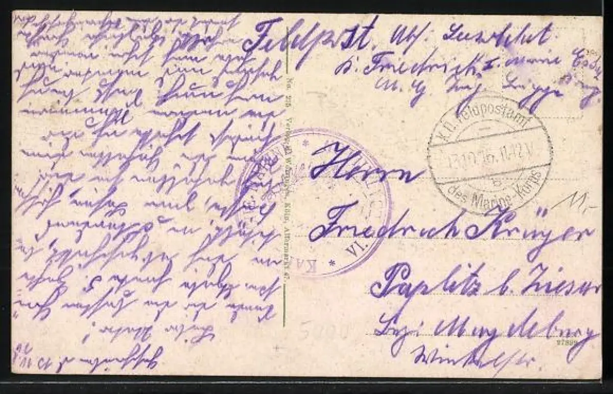 Personenbezogene Daten auf der Rückseite der Karte wurden durch blauen Textmarker unkenntlich gemacht. Die blauen Stellen sind auf die Vorderseite durchgeweicht und wirken sich negativ auf das Postkartenfoto aus