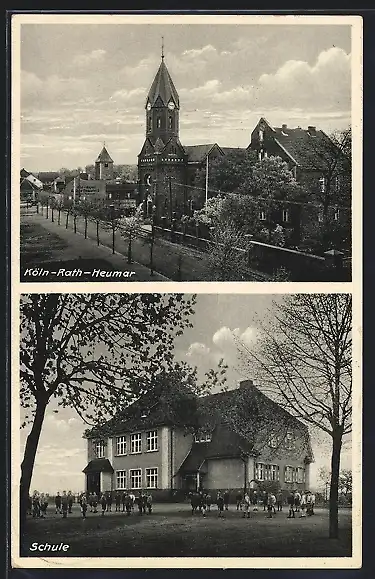 AK Köln-Rath-Heumar, Schule, Strassenpartie mit Kirche