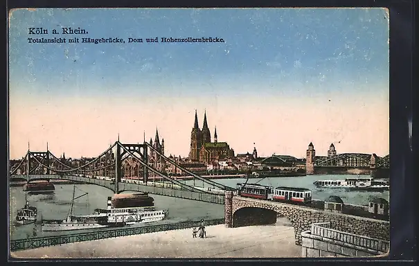 AK Köln /Rh., Totalansicht mit Hängebrücke, Dom und Hohenzollernbrücke, Strassenbahn