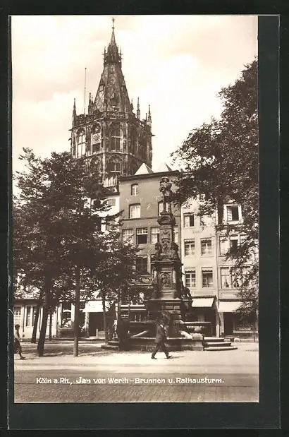 AK Köln / Rhein, Jan von Werth-Brunnen mit Rathausturm