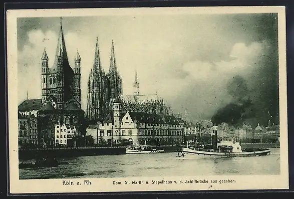 AK Köln, Rheindampfer in Fahrt vor dem Dom und der St. Martinskirche
