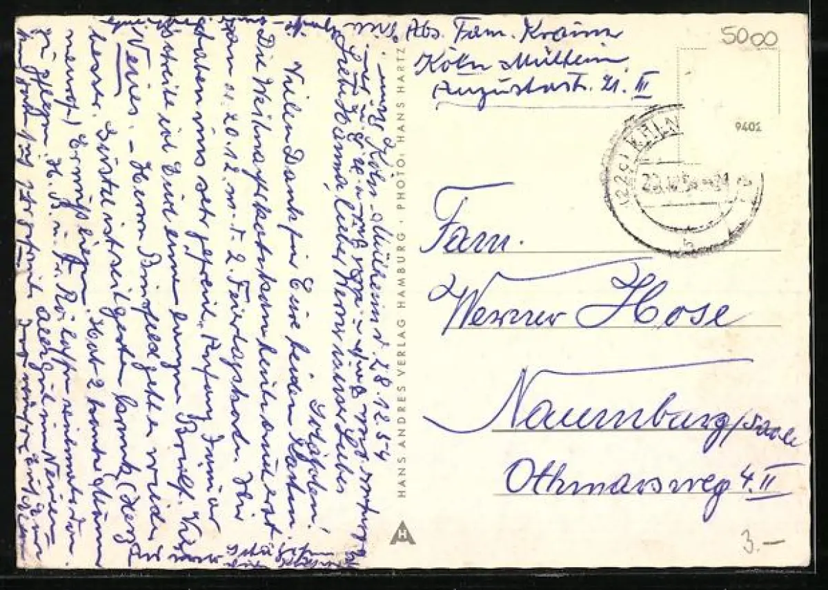 alte Ansichtskarte, gelaufen 1954, Briefmarke entfernt, rückseitig Oberflächenschaden, guter Zustand