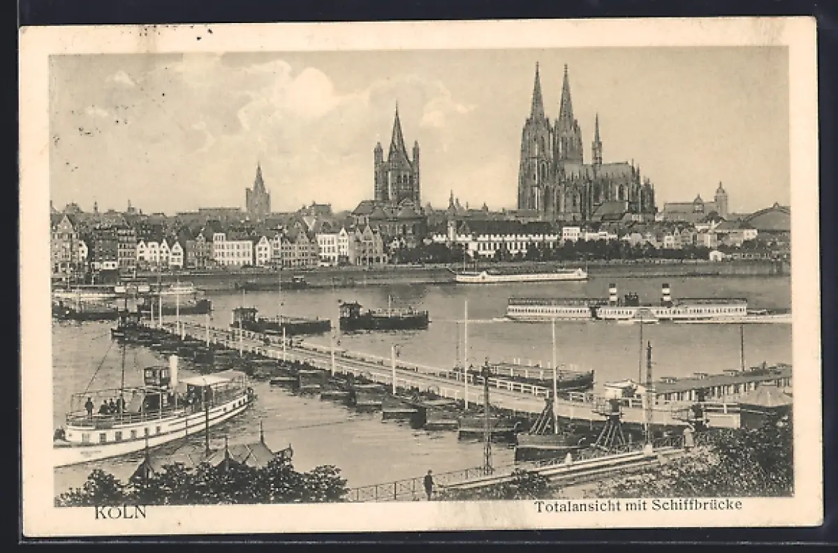 AK Köln, Totalansicht mit Dom und Schiffbrücke