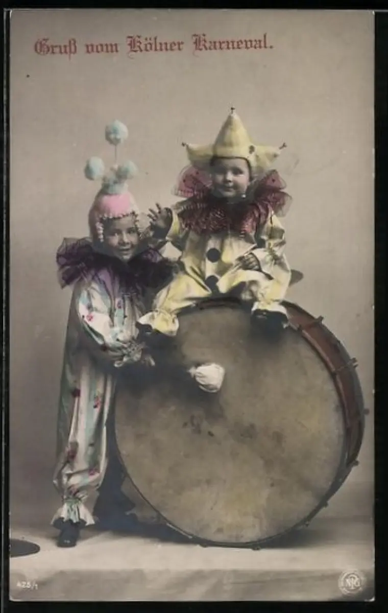 AK Köln, Zwei Kinder in Kostümen mit einer Trommel
