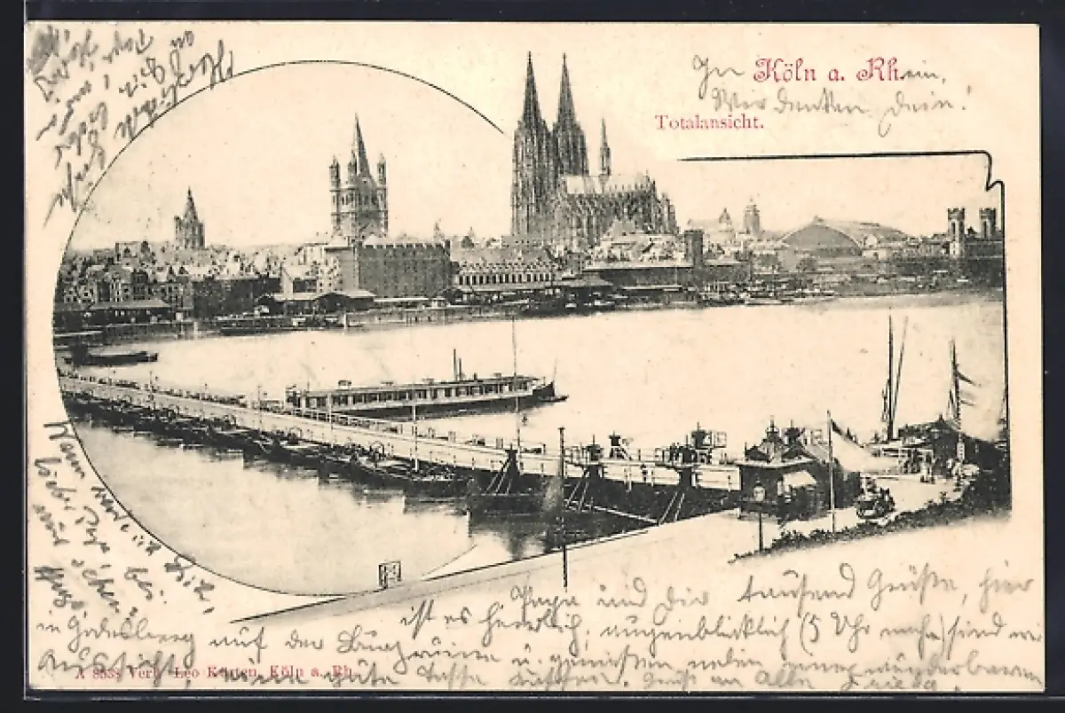 AK Köln a. Rh., Blick auf Bootsbrücke und Dom