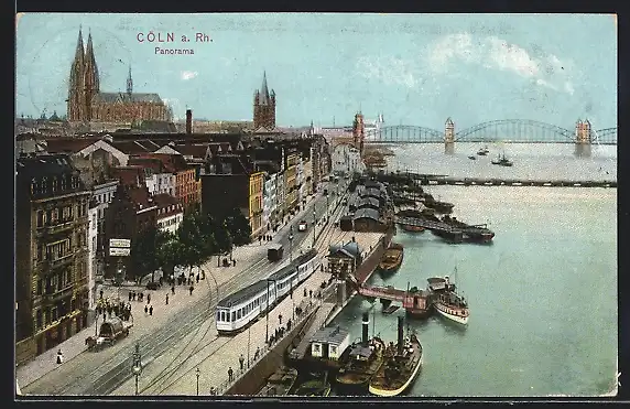 AK Köln a. Rhein, Strassenbahn am Ufer, Schiffsanlegestellen, der Dom
