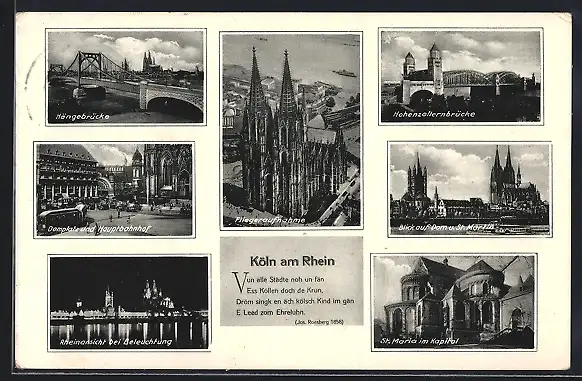 AK Köln am Rhein, Fliegeraufnahme vom Dom, Hängebrücke, Domplatz und Hauptbahnhof, Hohenzollernbrücke