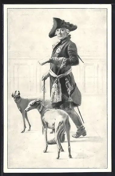 AK König Friedrich II. (der Grosse) in Uniform mit zwei Windhunden