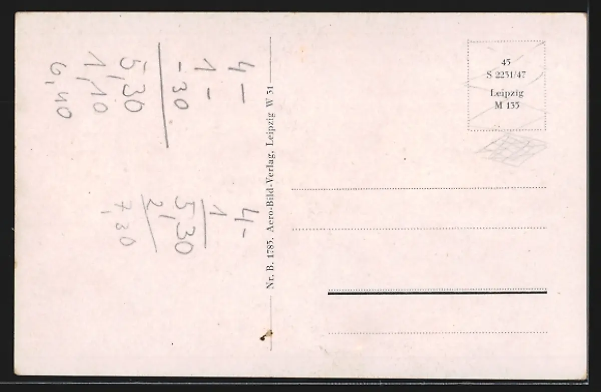 Personenbezogene Daten auf der Rückseite der Karte wurden durch blauen Textmarker unkenntlich gemacht. Die blauen Stellen sind auf die Vorderseite durchgeweicht und wirken sich negativ auf das Postkartenfoto aus