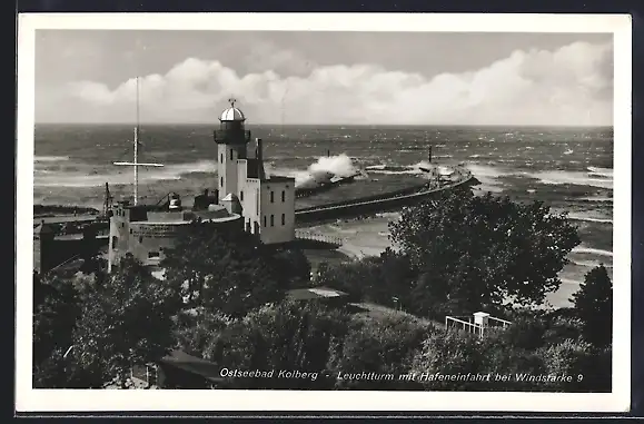 AK Kolberg, Leuchtturm mit Hafeneinfahrt bei Windstärke 9