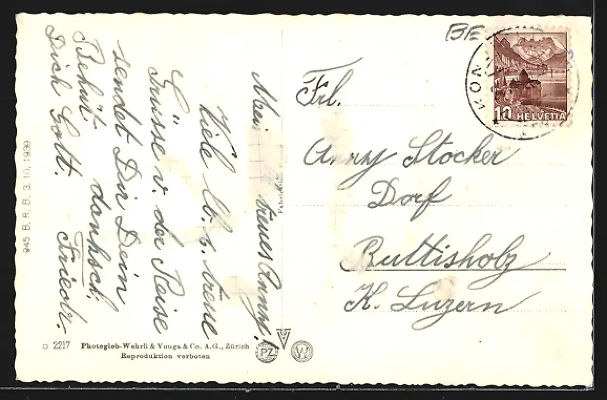 Personenbezogene Daten auf der Rückseite der Karte wurden durch blauen Textmarker unkenntlich gemacht. Die blauen Stellen sind auf die Vorderseite durchgeweicht und wirken sich negativ auf das Postkartenfoto aus