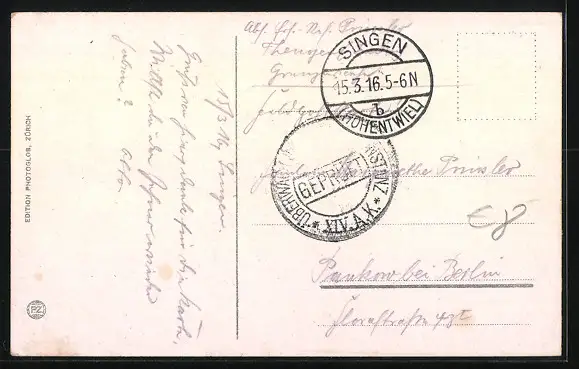 Personenbezogene Daten auf der Rückseite der Karte wurden durch blauen Textmarker unkenntlich gemacht. Die blauen Stellen sind auf die Vorderseite durchgeweicht und wirken sich negativ auf das Postkartenfoto aus