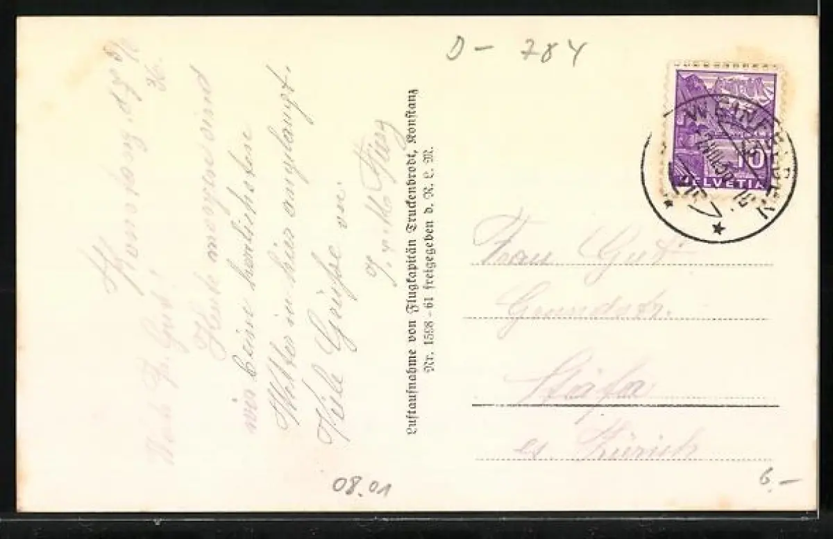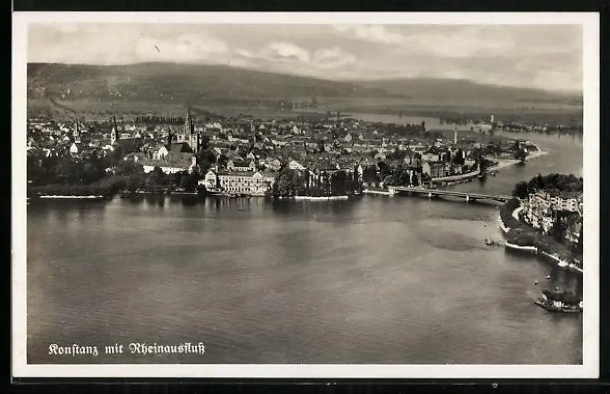 AK Konstanz, Ortsansicht mit Rheinausfluss aus der Vogelschau