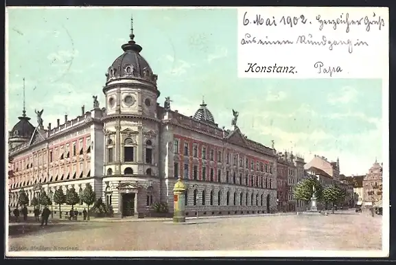 AK Konstanz, Strassenpartie mit Denkmal und Litfasssäule