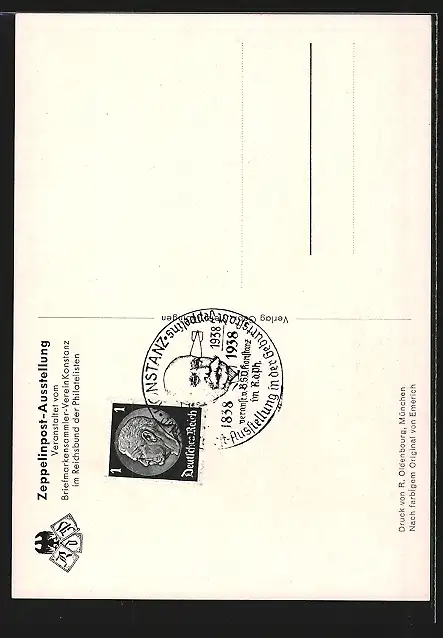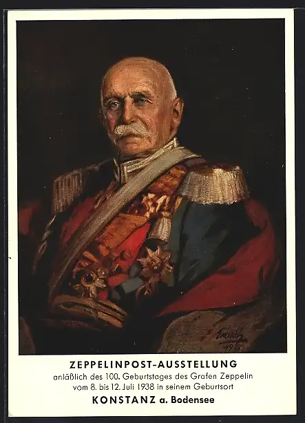 AK Konstanz, Zeppelinpost-Ausstellung, Portrait des Grafen Zeppelin in Uniform, zum 100. Geburtstag, im Juli 1938